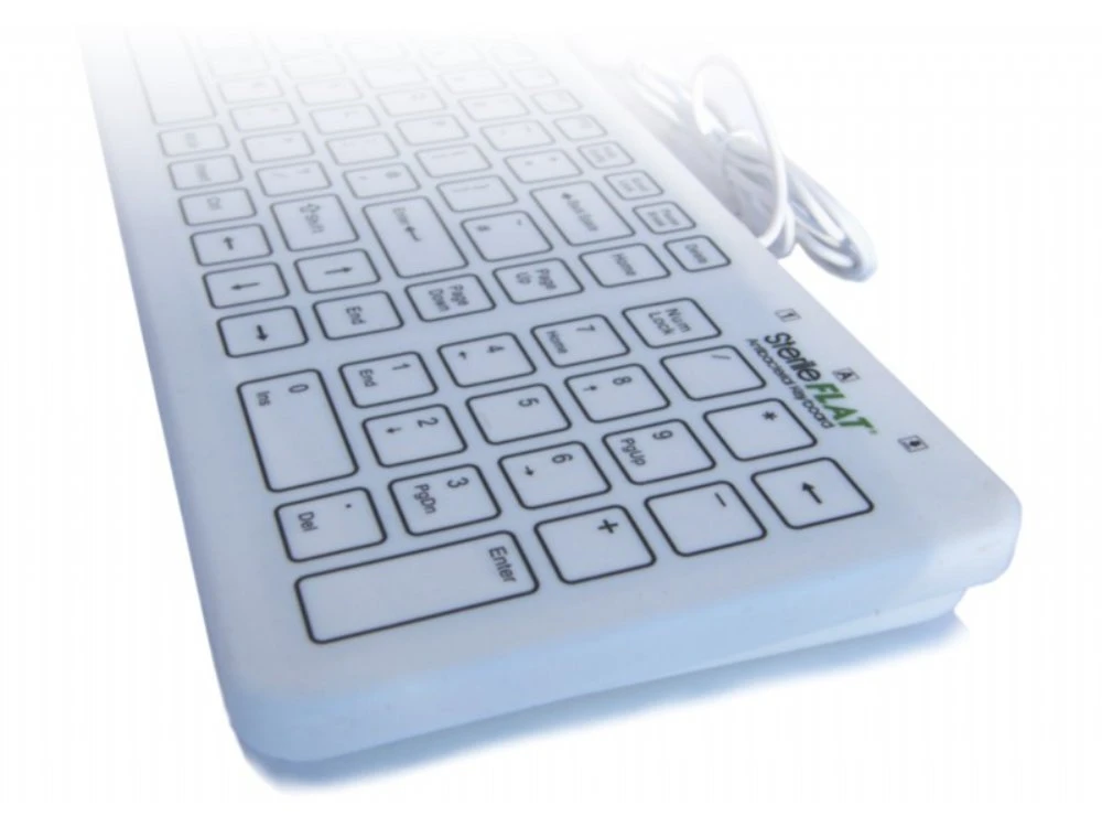 The SterileFlat Medical Keyboard offers a conventional style keyboard with an impregnated Nano Silver Antibacterial silicone membrane barrier, which can be used in all areas of clinical and medical environments.