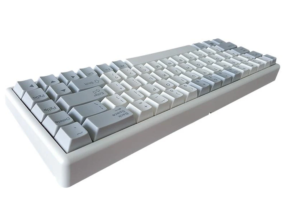 The keycaps are white and grey PBT with dark grey legends and the layout is programmable.