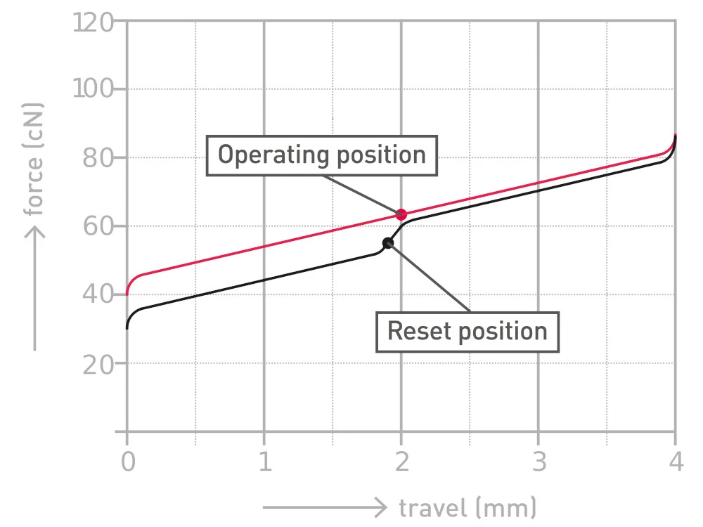- CHERRY MX Black Clear-Top switch: Without pressure point, linear actuation – switching function with a defined force of approx. 63,5cN without contact feedback