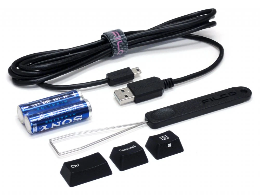 Includes: Keyboard, detachable cable, velcro cable tie, extra keys, keypuller, 2 x AA batteries, dust cover and manual.