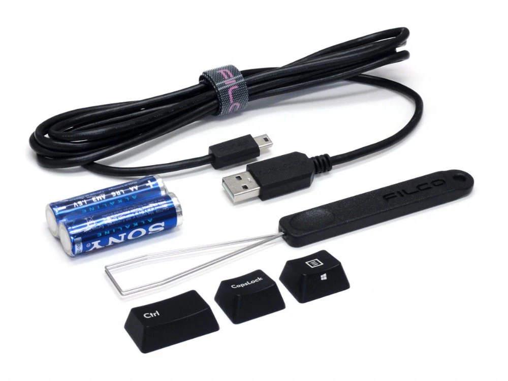 Includes: Keyboard, detachable cable, velcro cable tie, extra keys, keypuller, 2 x AA batteries, dust cover and manual.