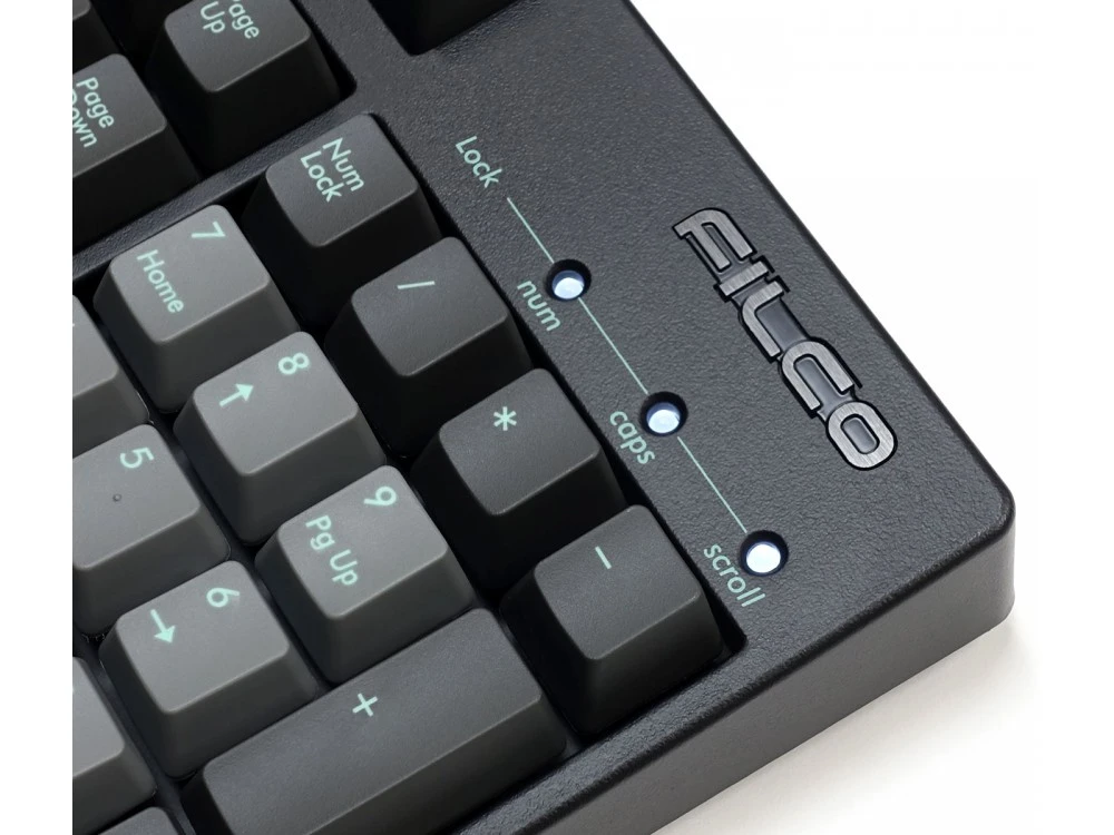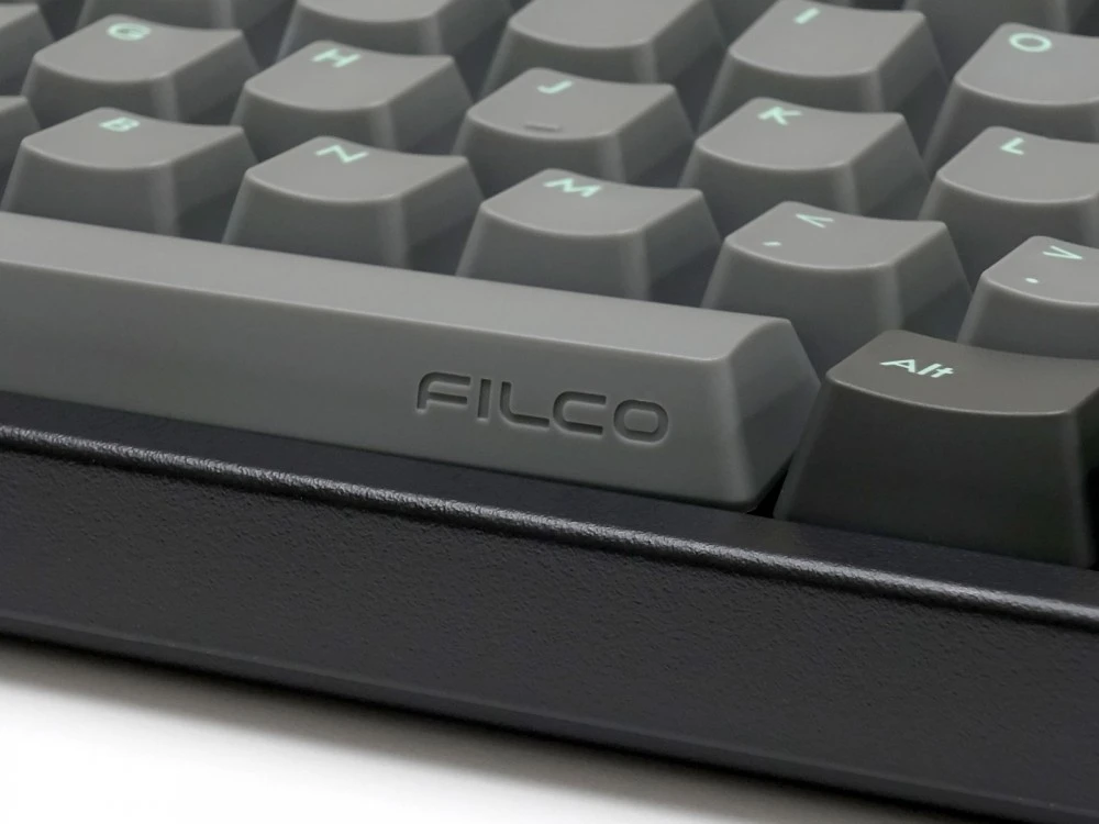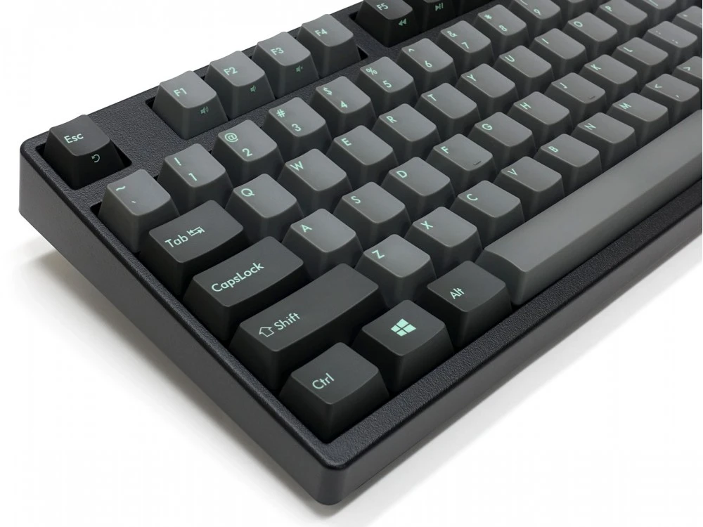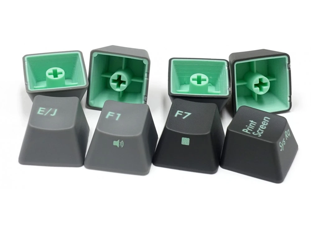 The keycaps are 2 different colours of double-shot PBT, asphalt and sky gray with celeste legends, a double shot keycap instead of having its legend lasered or printed on to it, actually has the legend running through it like a stick of rock so it will never wear away.